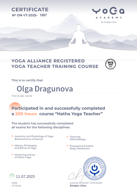 - сертификат Yoga Alliance «Hatha Yoga Teacher»