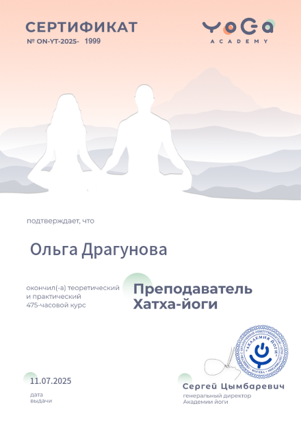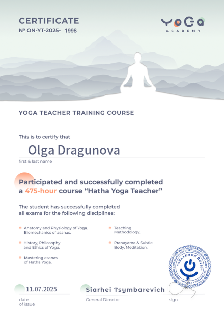 - сертификат Yoga Teacher Training Course «Hatha Yoga Teacher» Yoga Academy